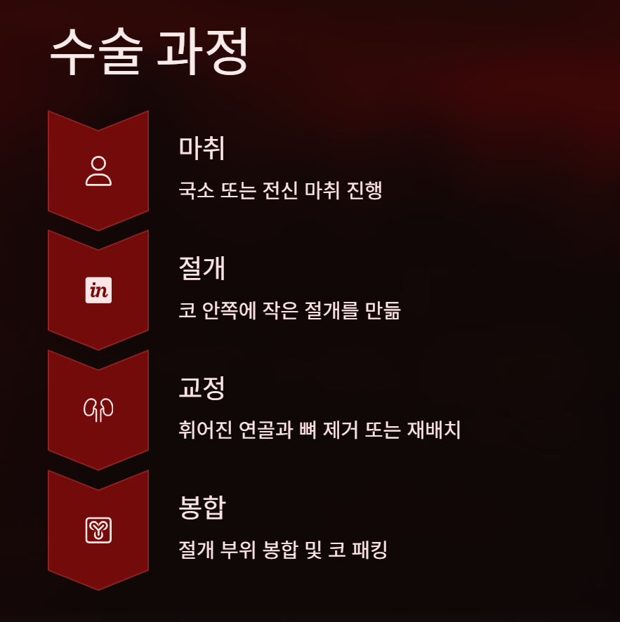 | 4. 수술 (비중격 교정술) | 콧구멍 안쪽을 통해 접근하기 때문에 겉으로 흉터가 남지 않아요. 휘어진 연골과 뼈 일부를 제거하거나 펴서 바로 세워주는 수술이에요. 보통 1시간 내외로 끝나고, 비염 수술 등을 함께 하기도 해요. |