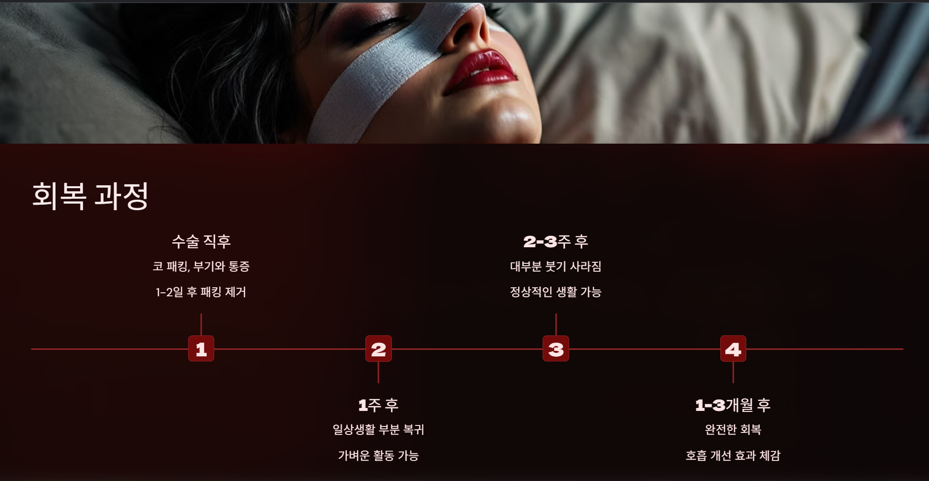 | 5. 회복 및 후관리 | 수술 후 지혈을 위해 1~2일 정도 솜을 넣어두는데, 이게 좀 답답해요. 솜을 빼고 나면, 약 2~4주간 통원 치료를 하면서 코 세척 등으로 관리해주면 점차 편안하게 숨 쉴 수 있게 됩니다. |