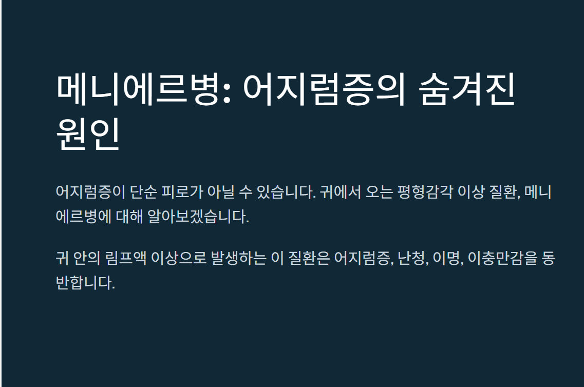 - 어지럼증과 함께 한쪽 귀의 청력 저하, 이명, 귀 먹먹함이 동반될 때
