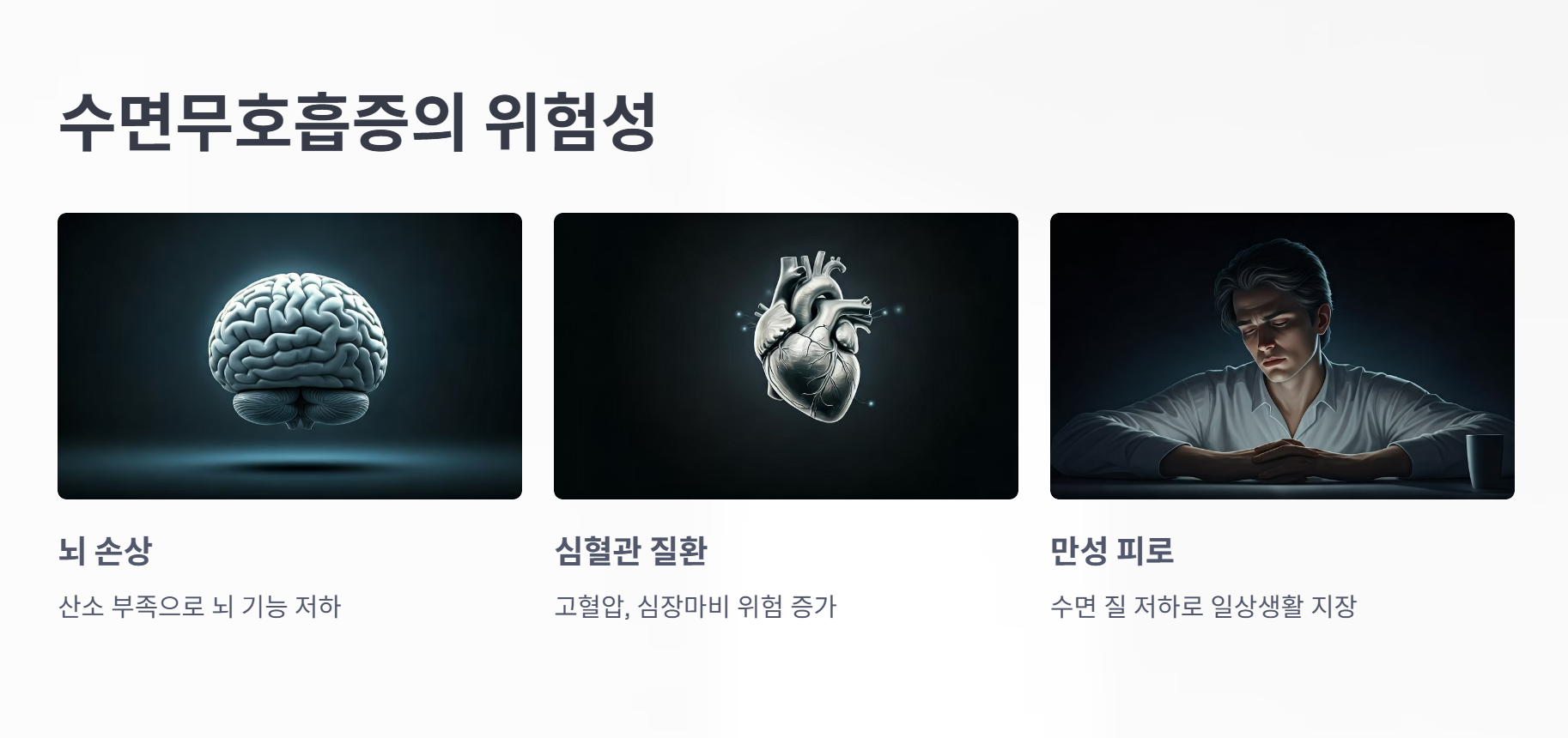 - 심혈관 질환: 산소 부족으로 심장에 부담이 커져 고혈압, 부정맥, 심근경색, 뇌졸중 위험이 높아져요.