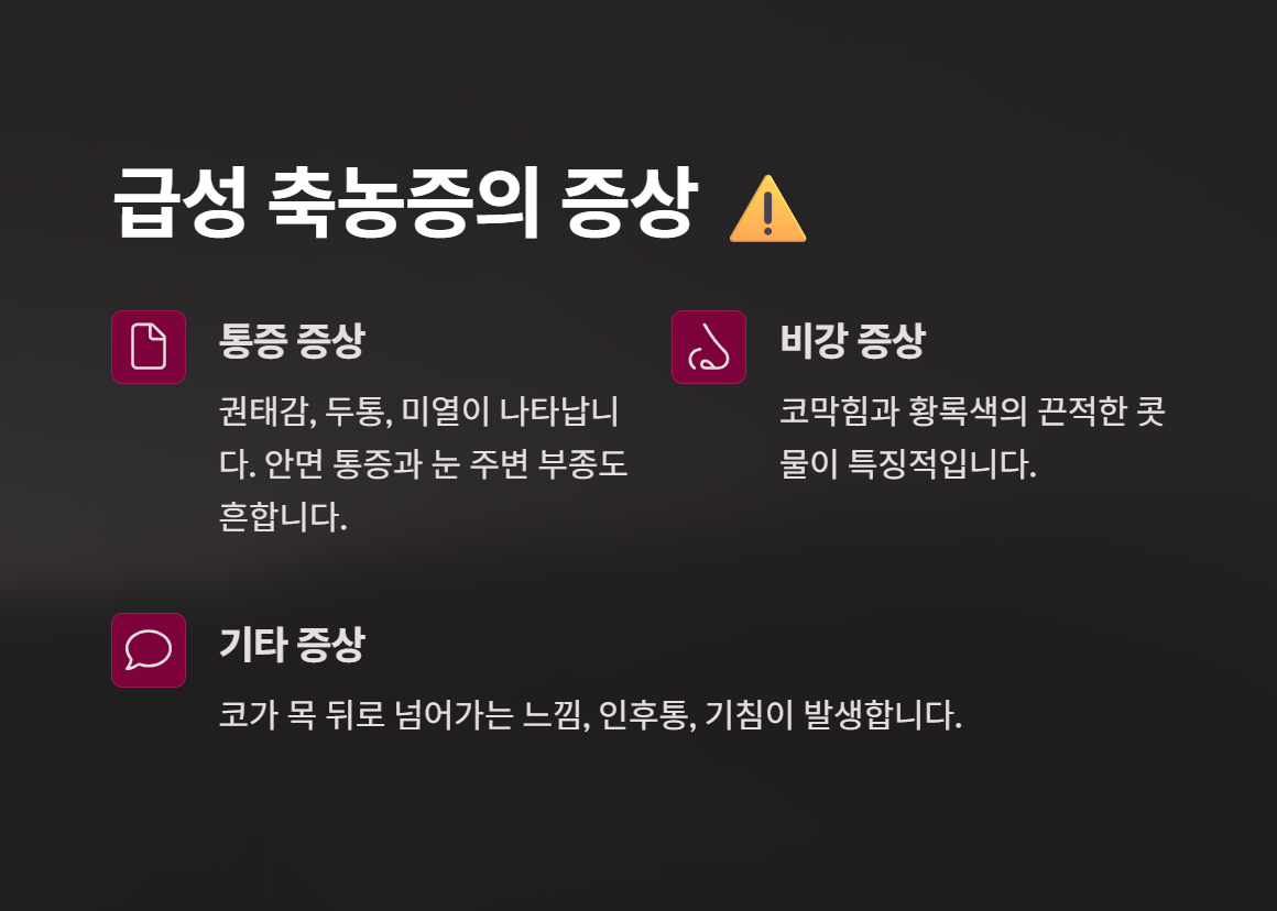 주요 증상: 코막힘, 누런 콧물, 얼굴 통증